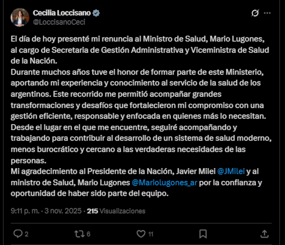 La viceministra de Salud, Cecilia Loccisano, presentó su renuncia al cargo que ocupaba como número dos del ministerio que conduce Mario Lugones. Lo hizo a través de sus redes sociales, donde explicó que había decidido dar un paso al costado “tras muchos años de trabajo en la gestión pública”, y que desde ahora enfocará su carrera en el sector privado. Su salida fue oficializada por el Decreto 783/2025 publicado en el Boletín Oficial.
