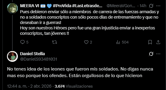 A partir de ese posteo, una militante kirchnerista cuestionó el envío de conscriptos al conflicto, en línea con una mirada que sostiene que los combatientes eran jóvenes sin preparación obligados a ir a la guerra.
